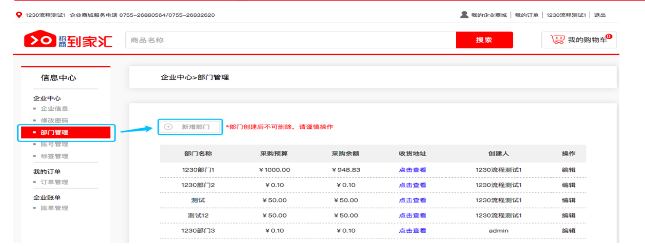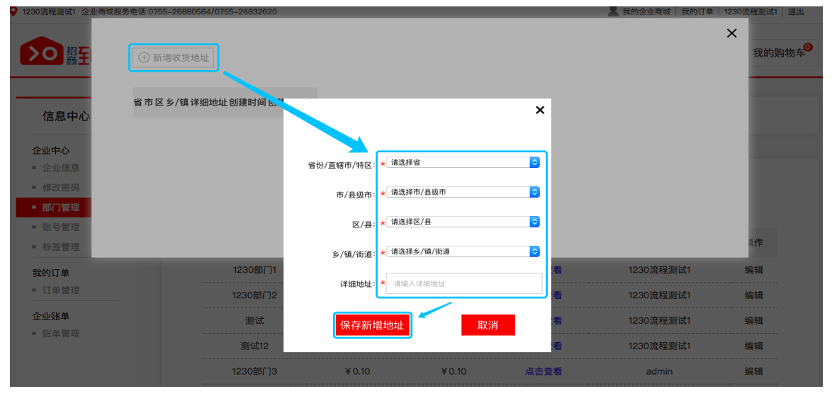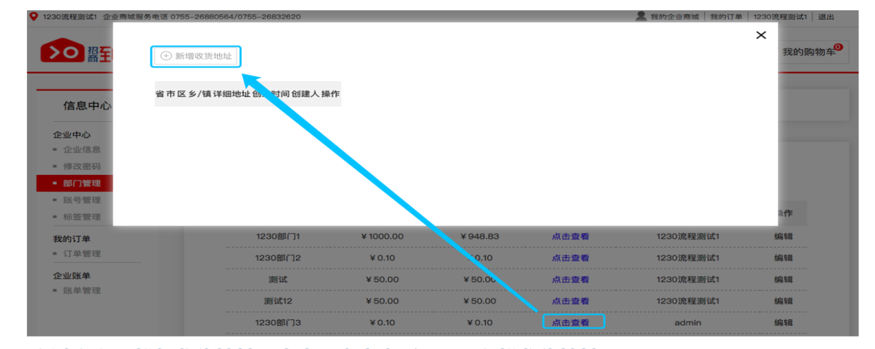 03新建部门需要新增收货地址,点击“点击查看——新增收货地址”