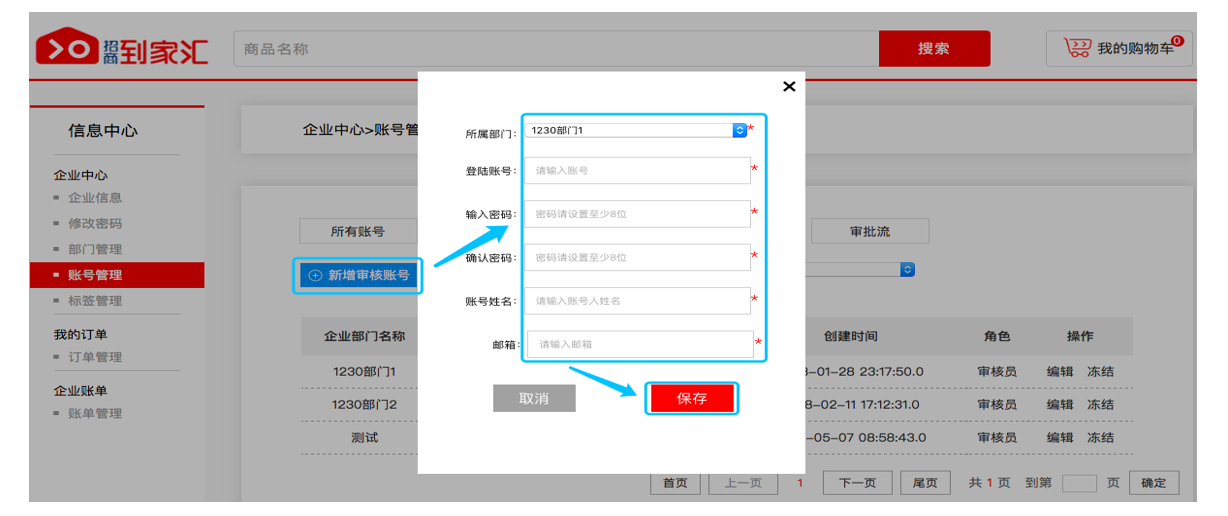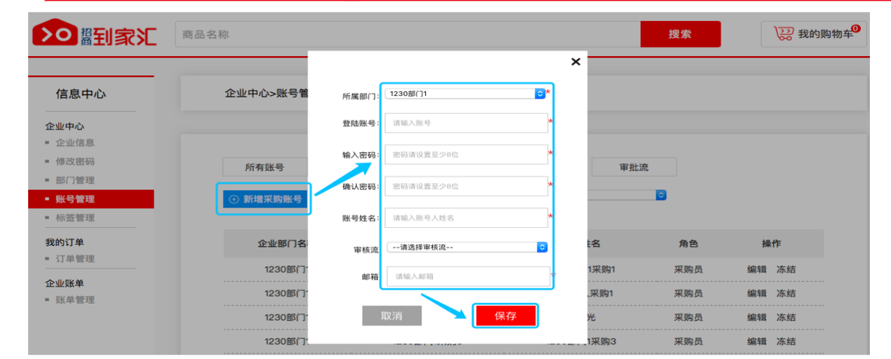 02填写账号相关信息,点击“保存”(注:采购账号名称规范:公司简称+部门名称+采购,如:招商到家汇综合采购)