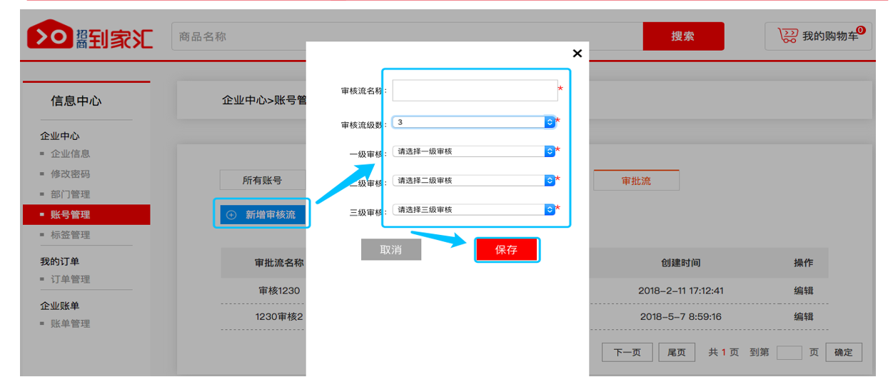 02填写审批流相关信息,根据需要选择审核级数及审核账号,点击“保存”(注:审核流名称规范:公司简称+部门名称+审核流,如:招商到家汇综合审核流)