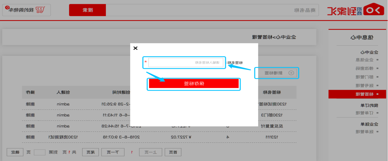 02输入新标签关键词,点击“保存标签”,完成操作。*例如:设置“办公用品”与“固定资产”两个标签,将采购物资进行分类,可以在订单管理与对账/开票模块进行筛选,从而快速检索所需订单。
